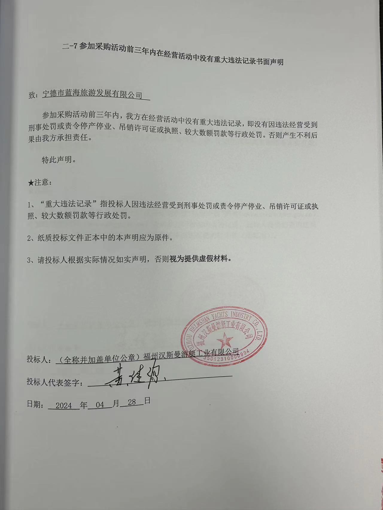 中標人名稱:福州漢斯曼游艇工業(yè)有限公司